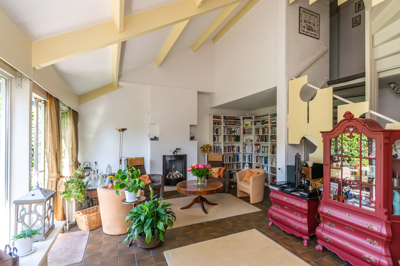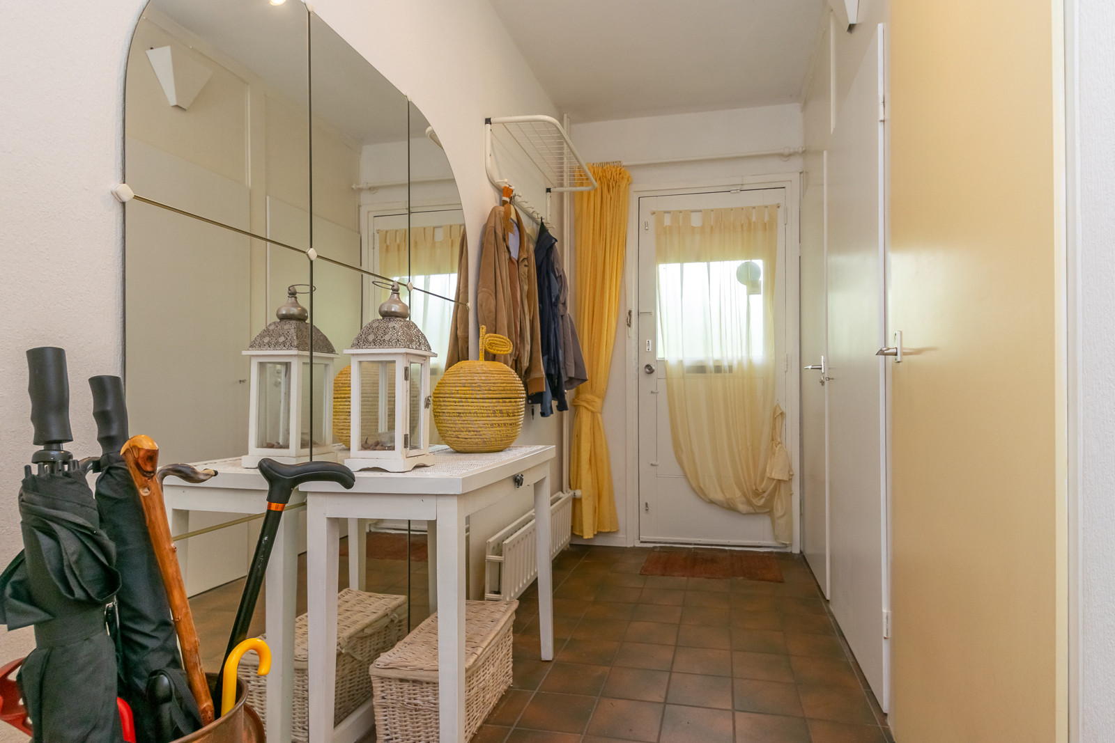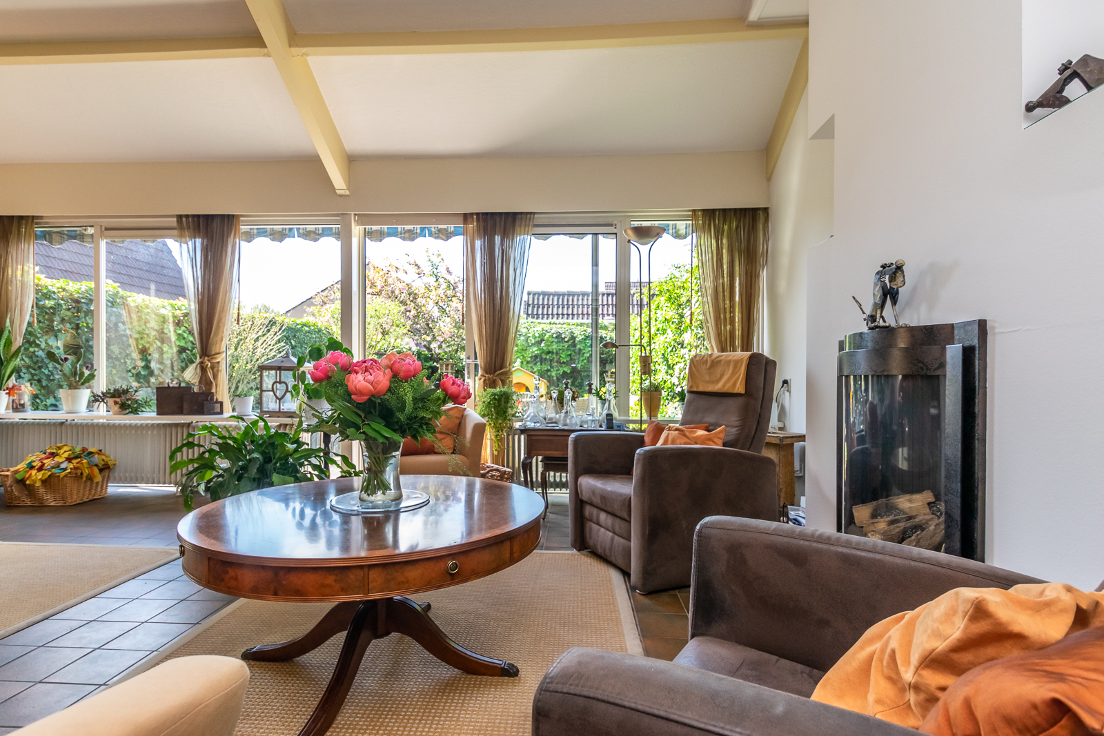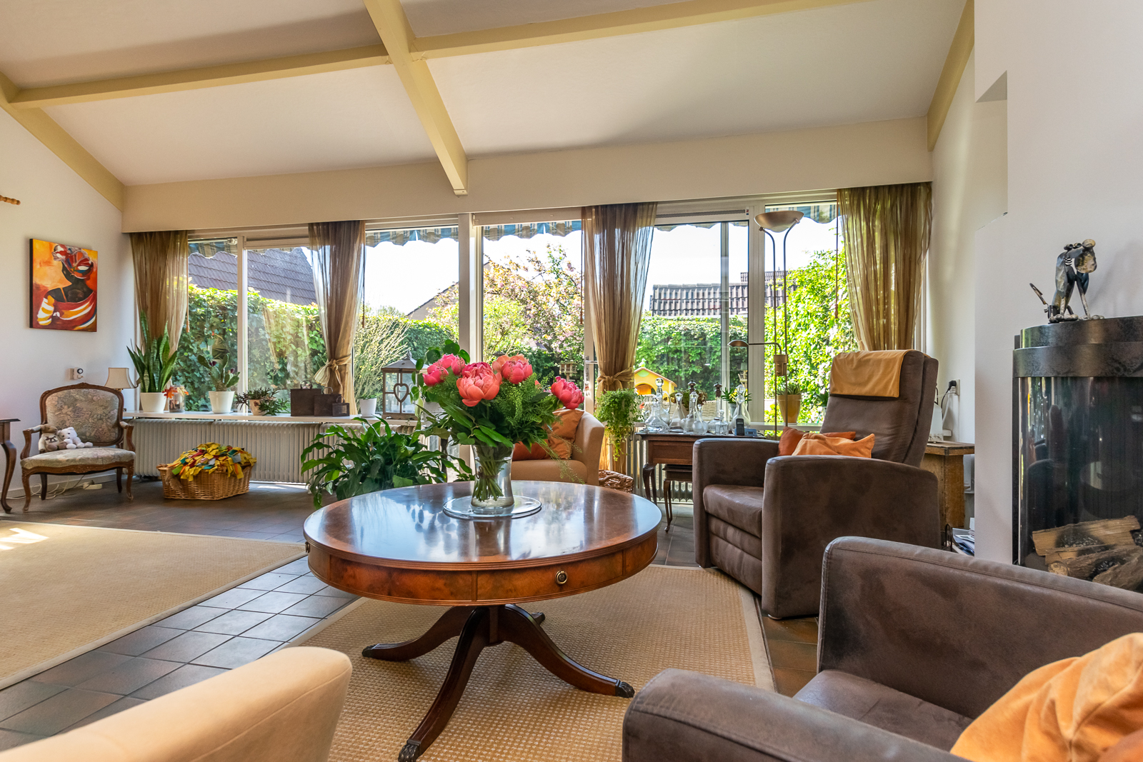 Hal, entree met toilet, meterkast, wasruimte, tuingerichte woonkamer met speelse trapopgang en hobbyhoek, sfeervolle gashaard en een half open keuken met een keramische kookplaat, oven, keukenboiler, koelkast en diepvries.