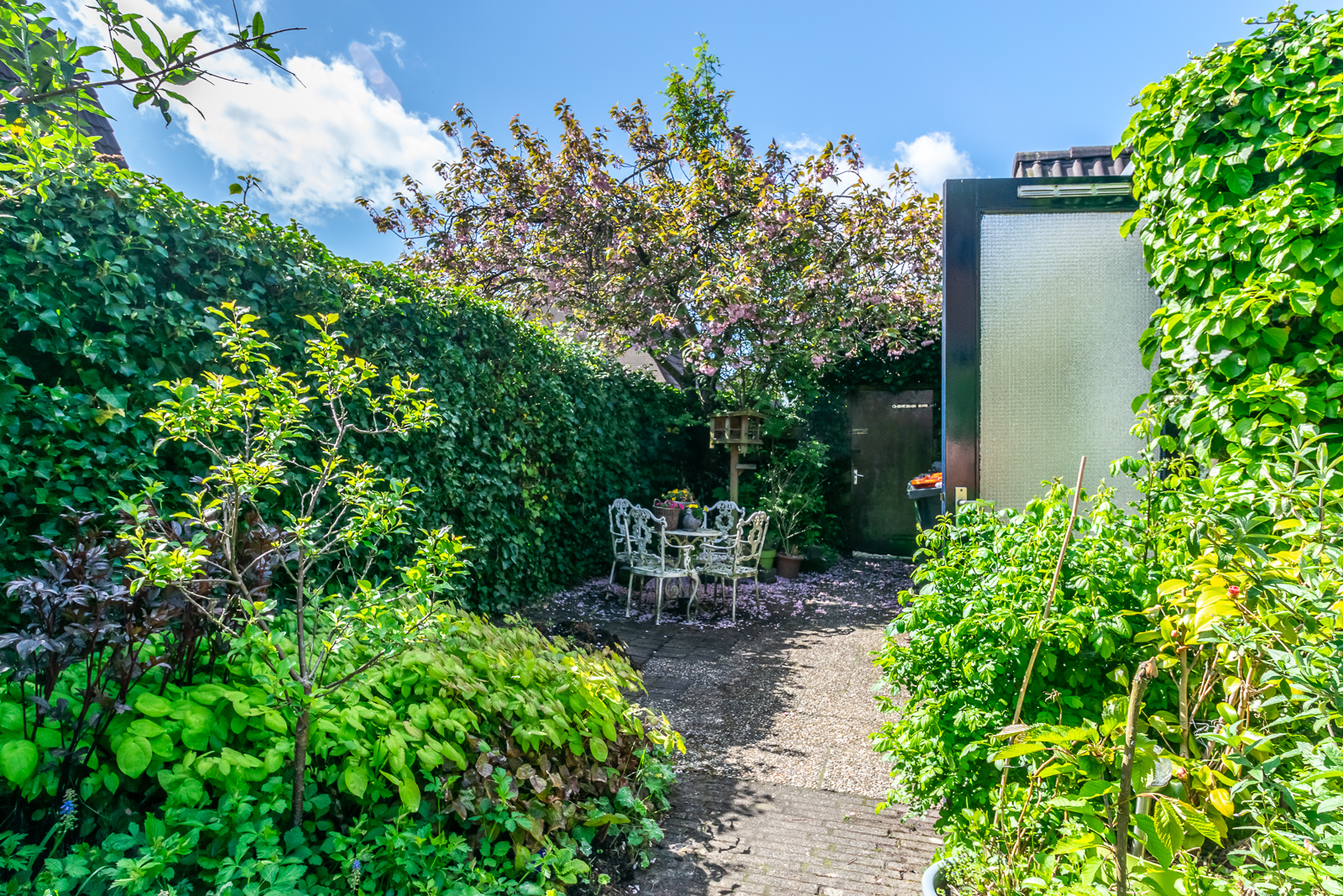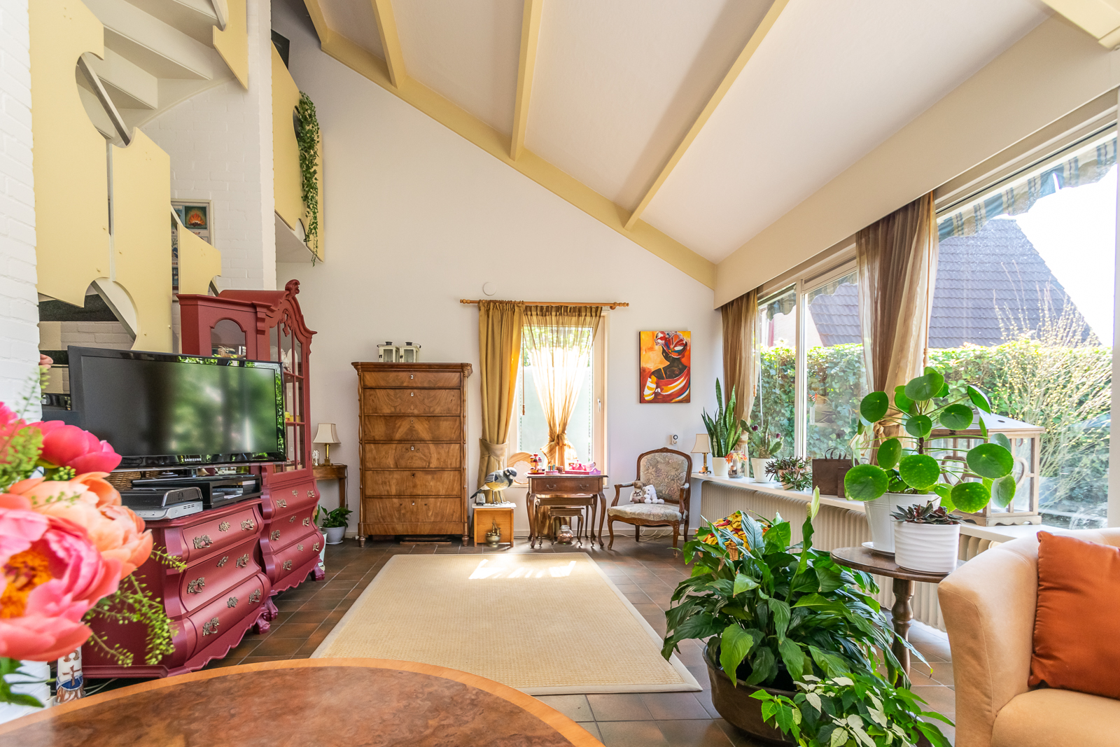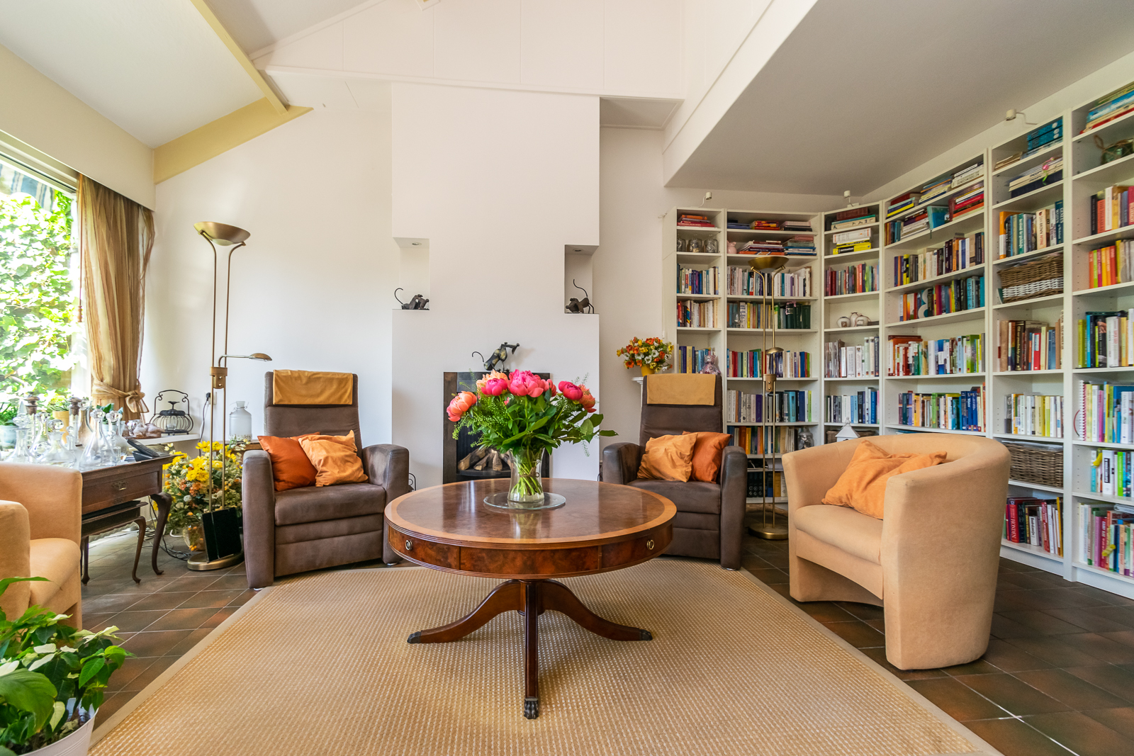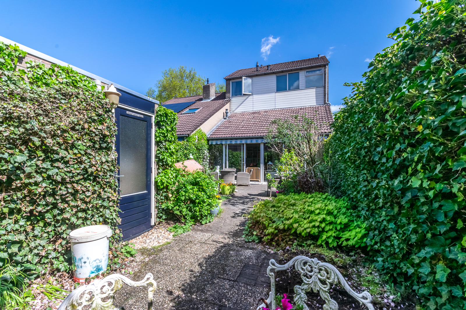 Hal, entree met toilet, meterkast, wasruimte, tuingerichte woonkamer met speelse trapopgang en hobbyhoek, sfeervolle gashaard en een half open keuken met een keramische kookplaat, oven, keukenboiler, koelkast en diepvries.