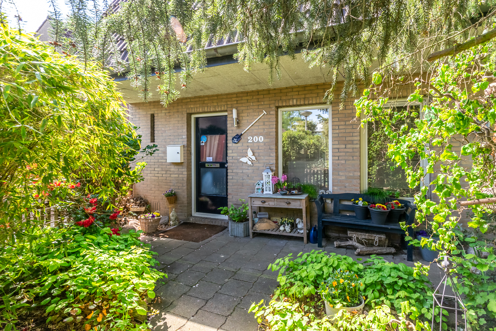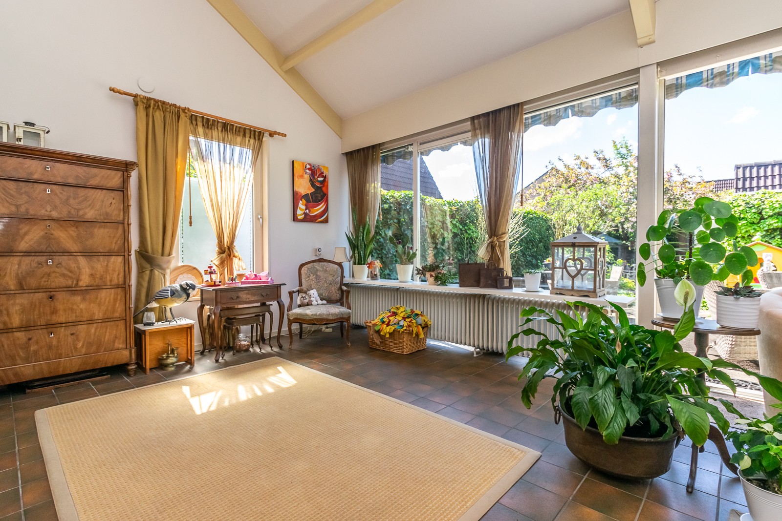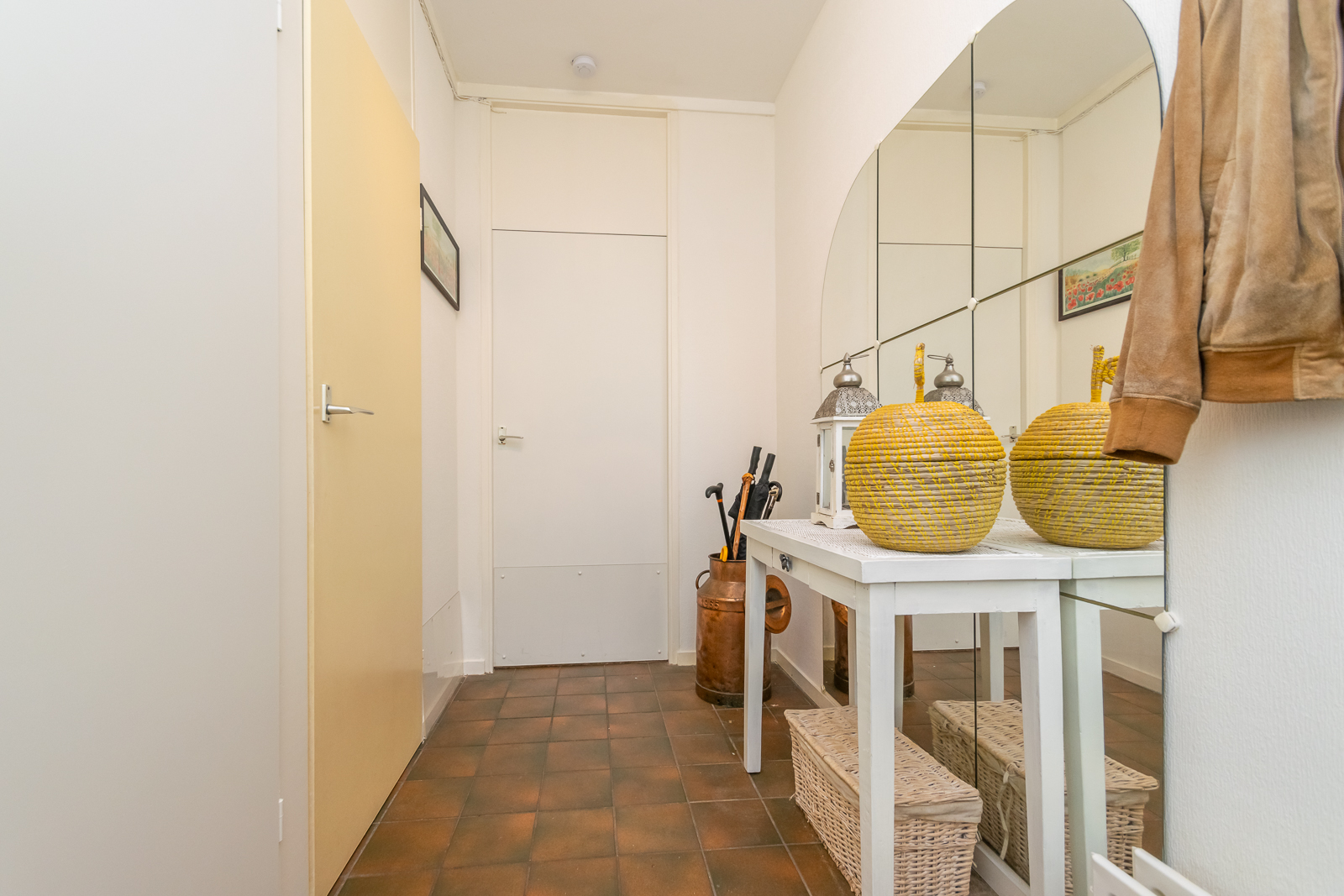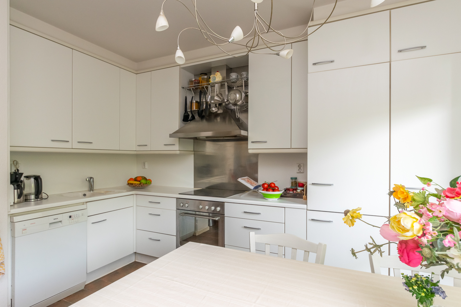 Hal, entree met toilet, meterkast, wasruimte, tuingerichte woonkamer met speelse trapopgang en hobbyhoek, sfeervolle gashaard en een half open keuken met een keramische kookplaat, oven, keukenboiler, koelkast en diepvries.