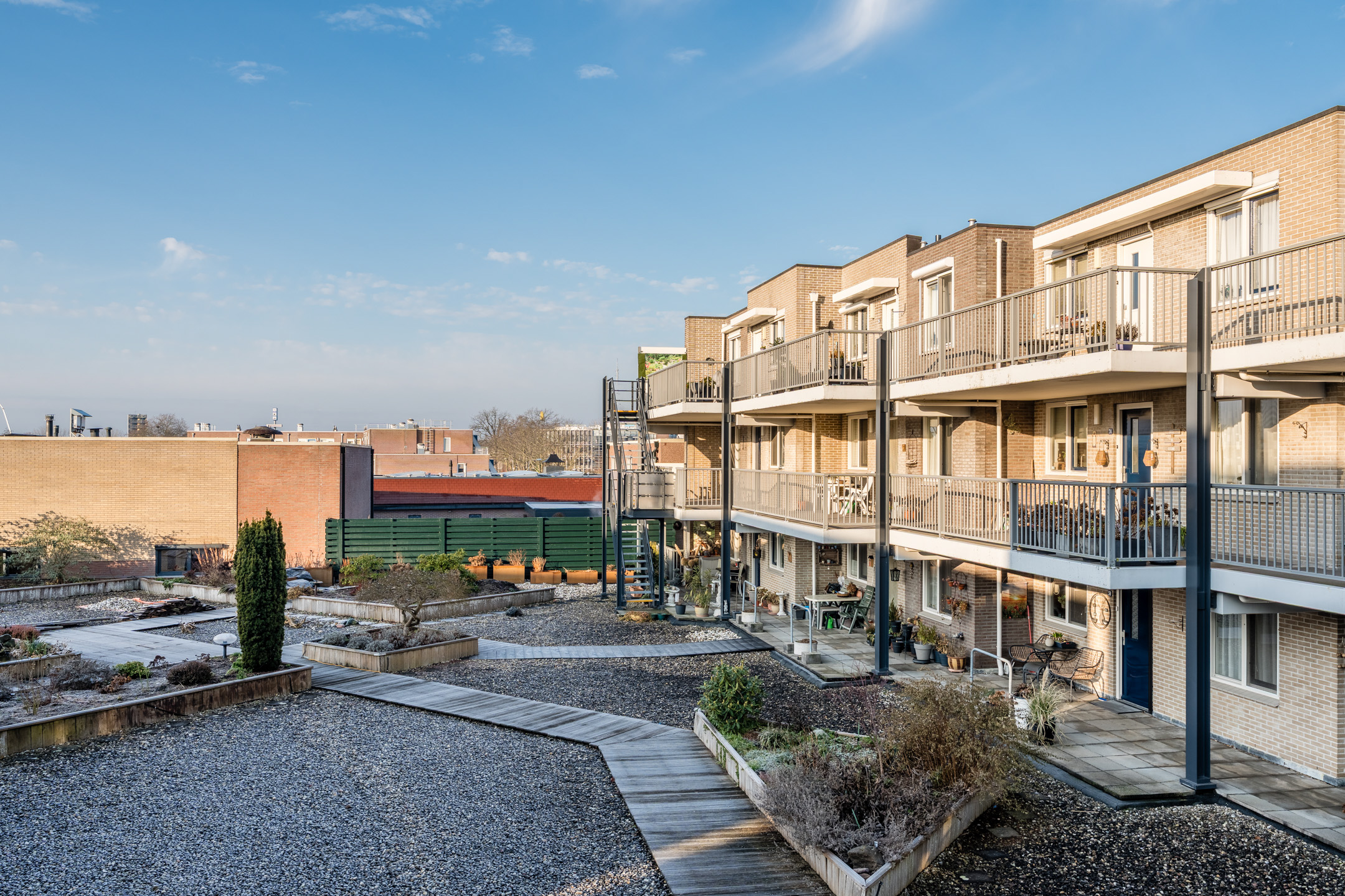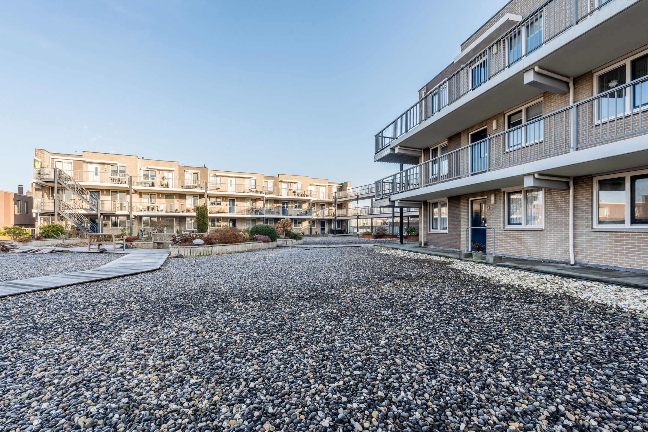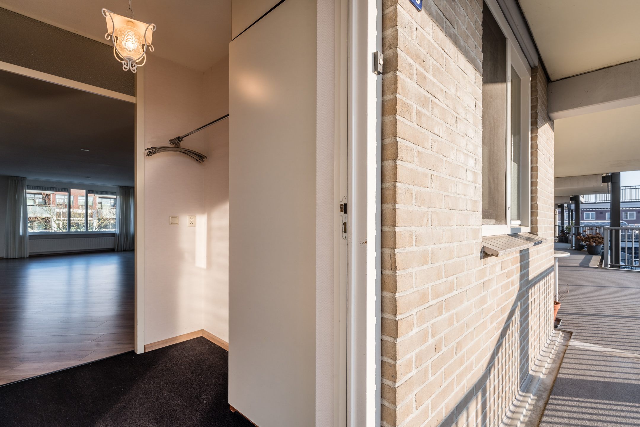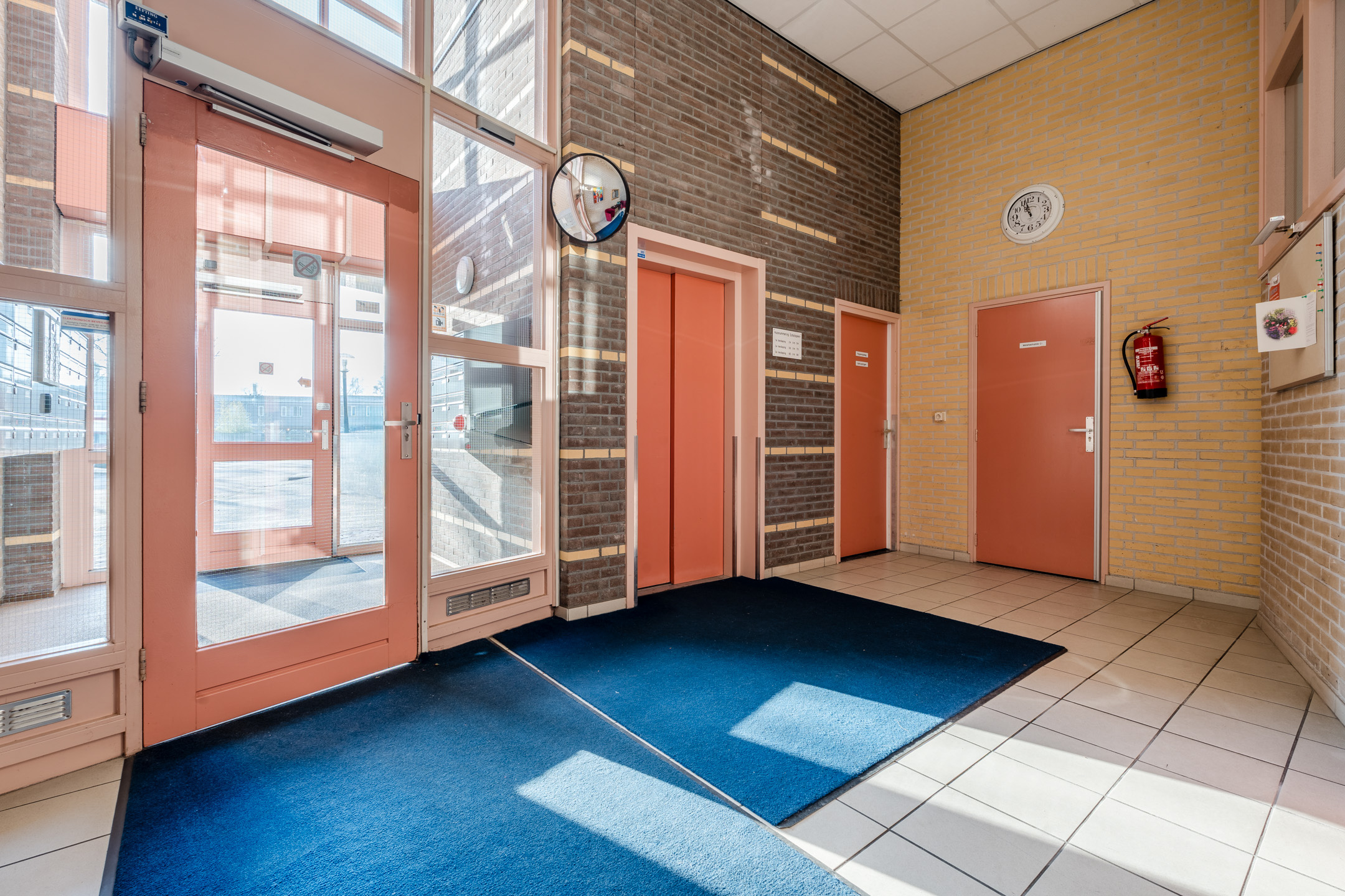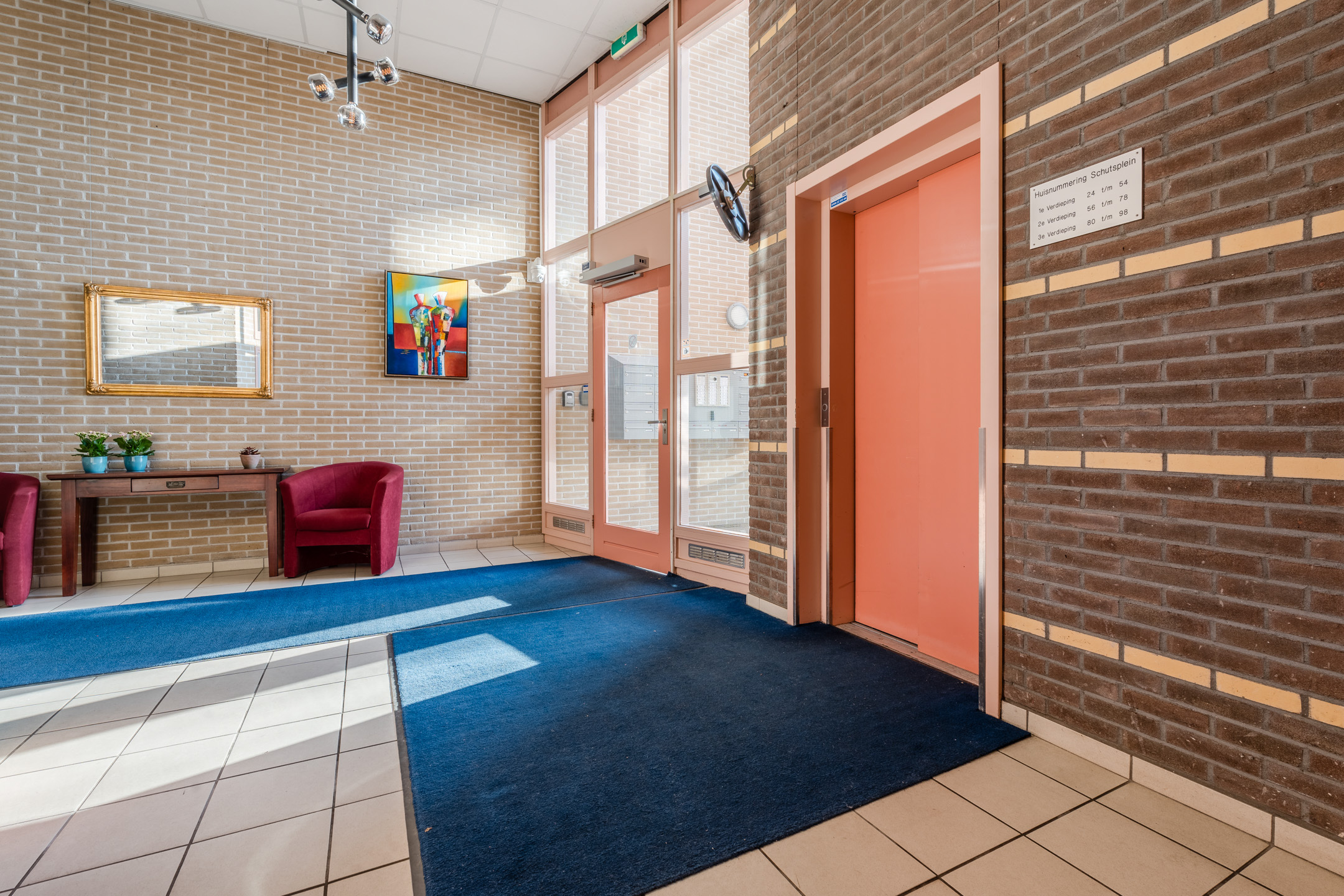 Via de ingang aan het Schutsplein kom je in de centrale hal met intercominstallatie, brievenbussen en de lift en trappenopgang naar de verdiepingen.