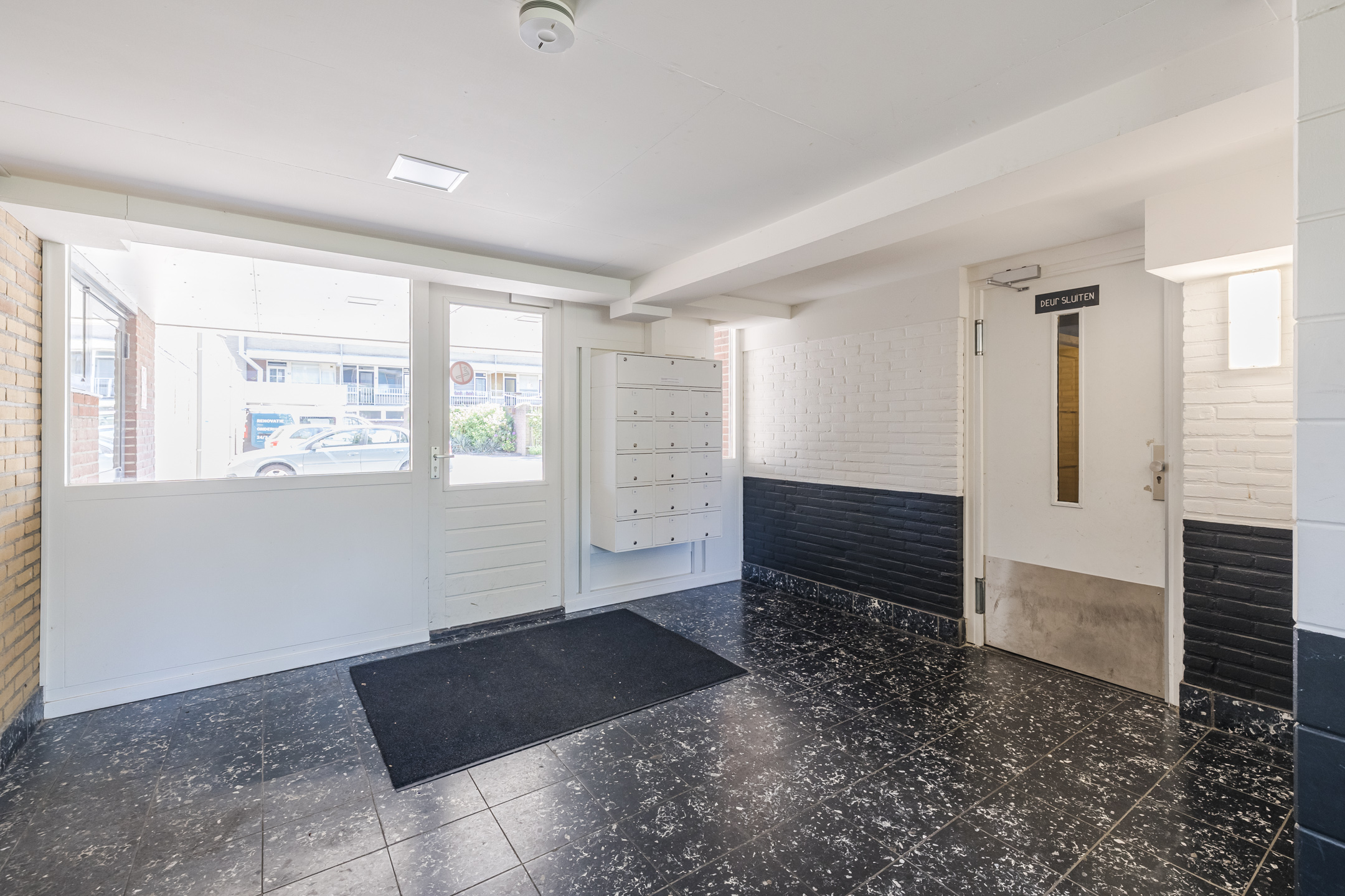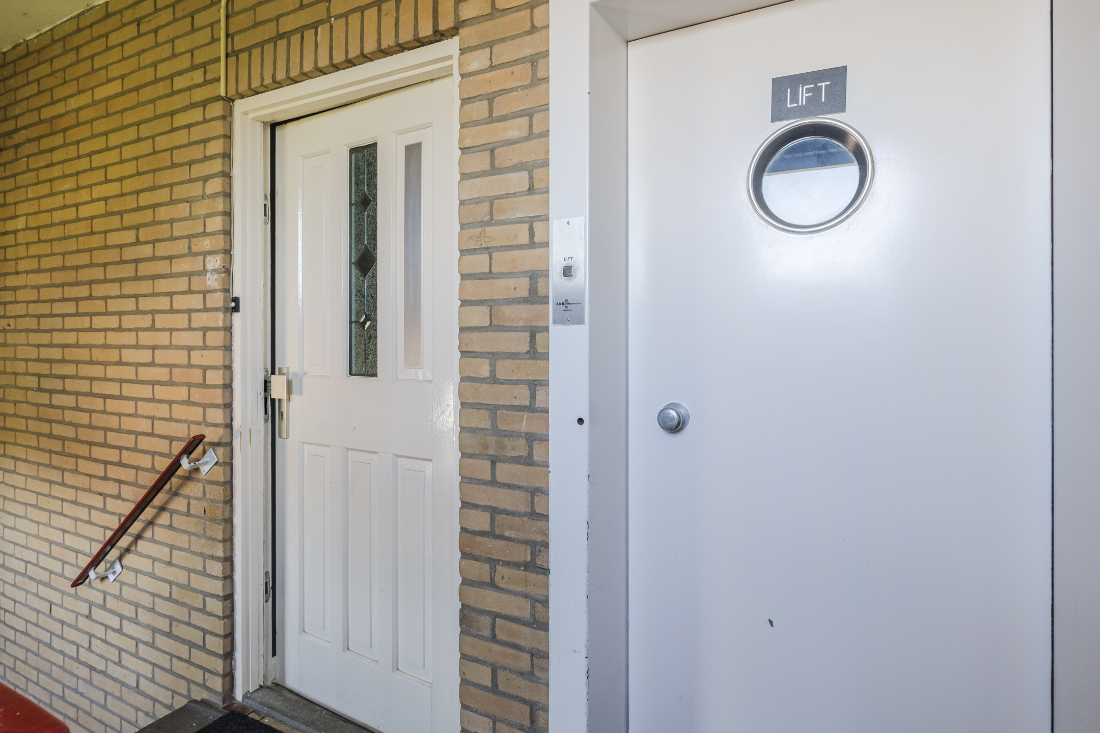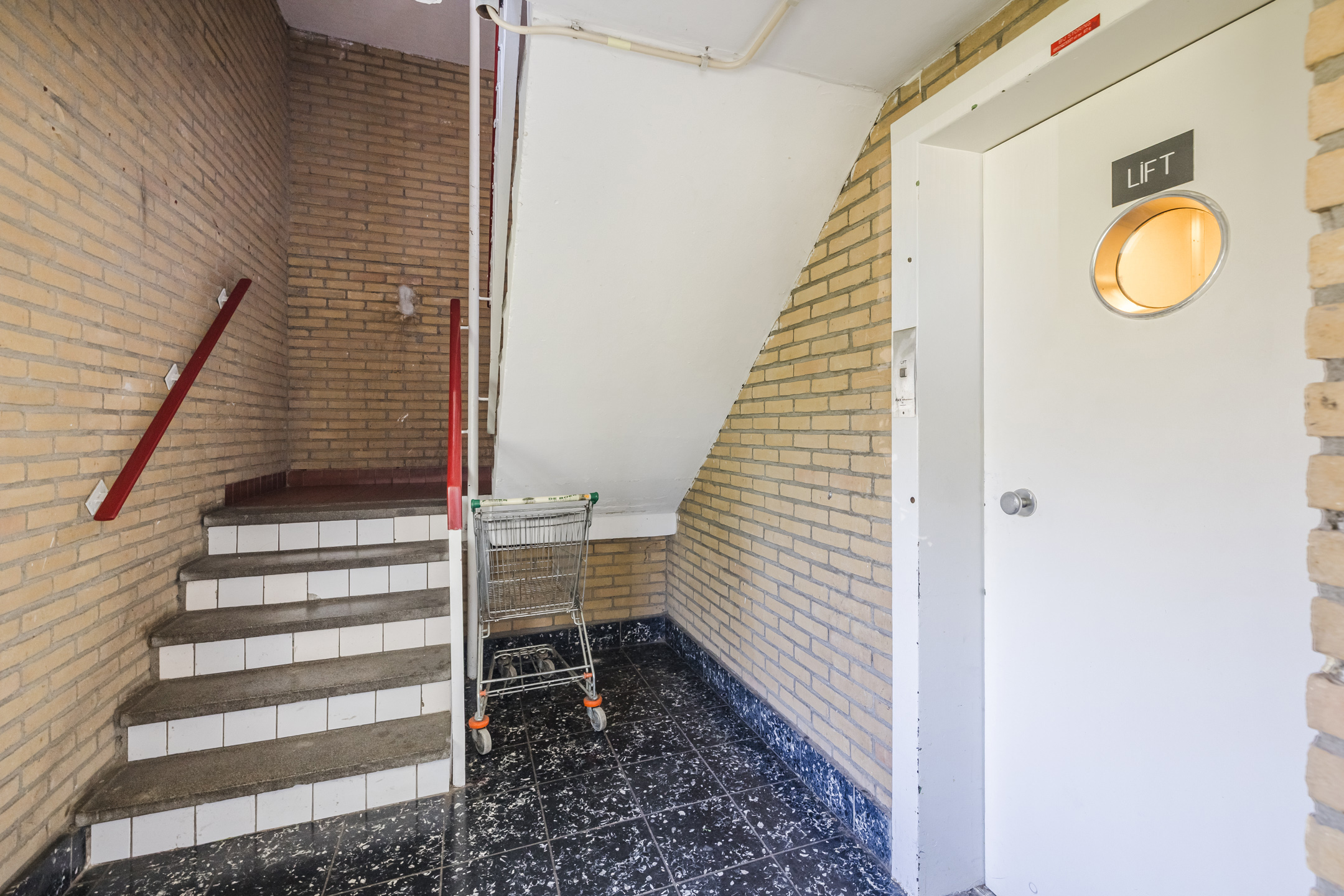 Gezamenlijke entree met intercominstallatie, brievenbus, trapopgang en lift.