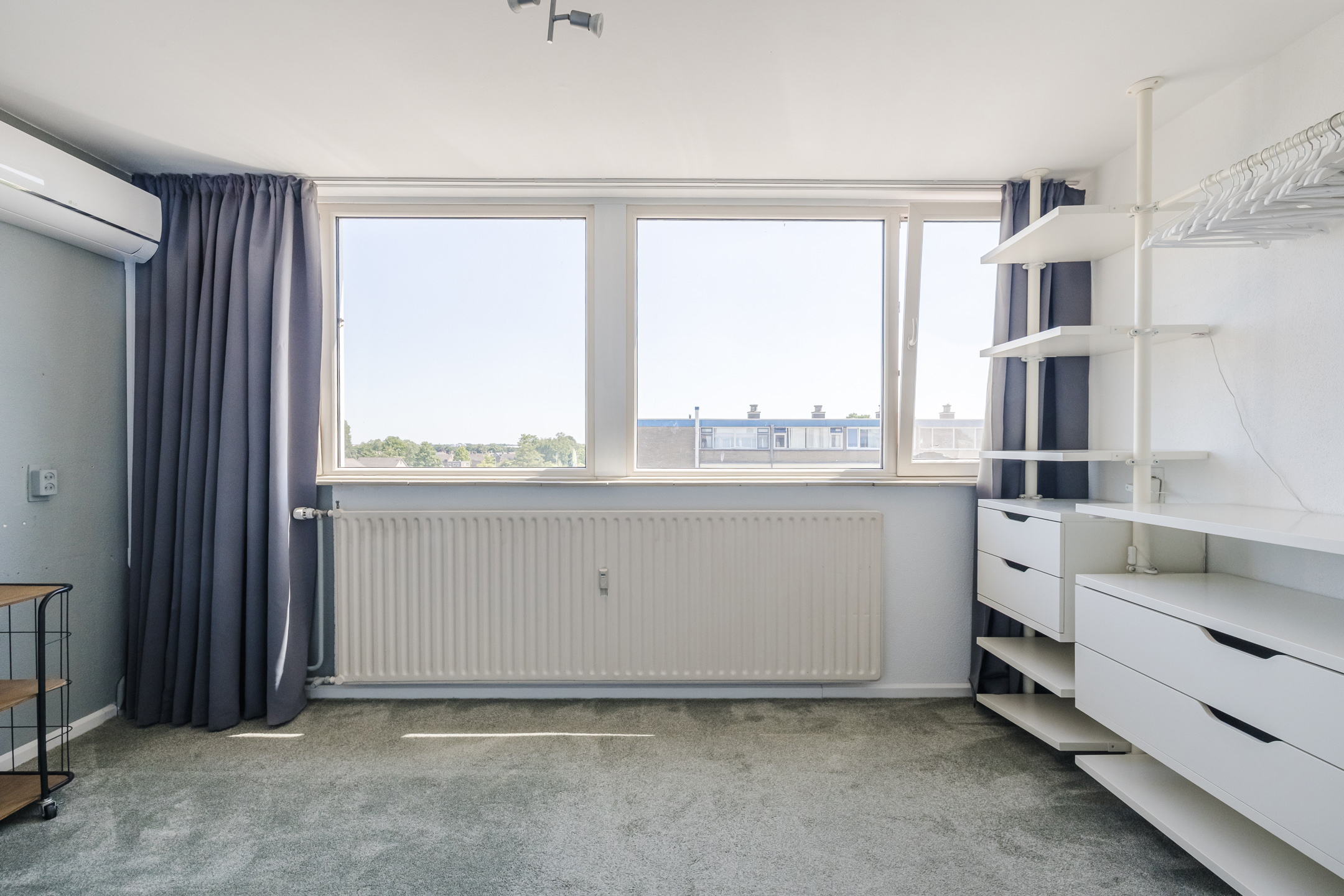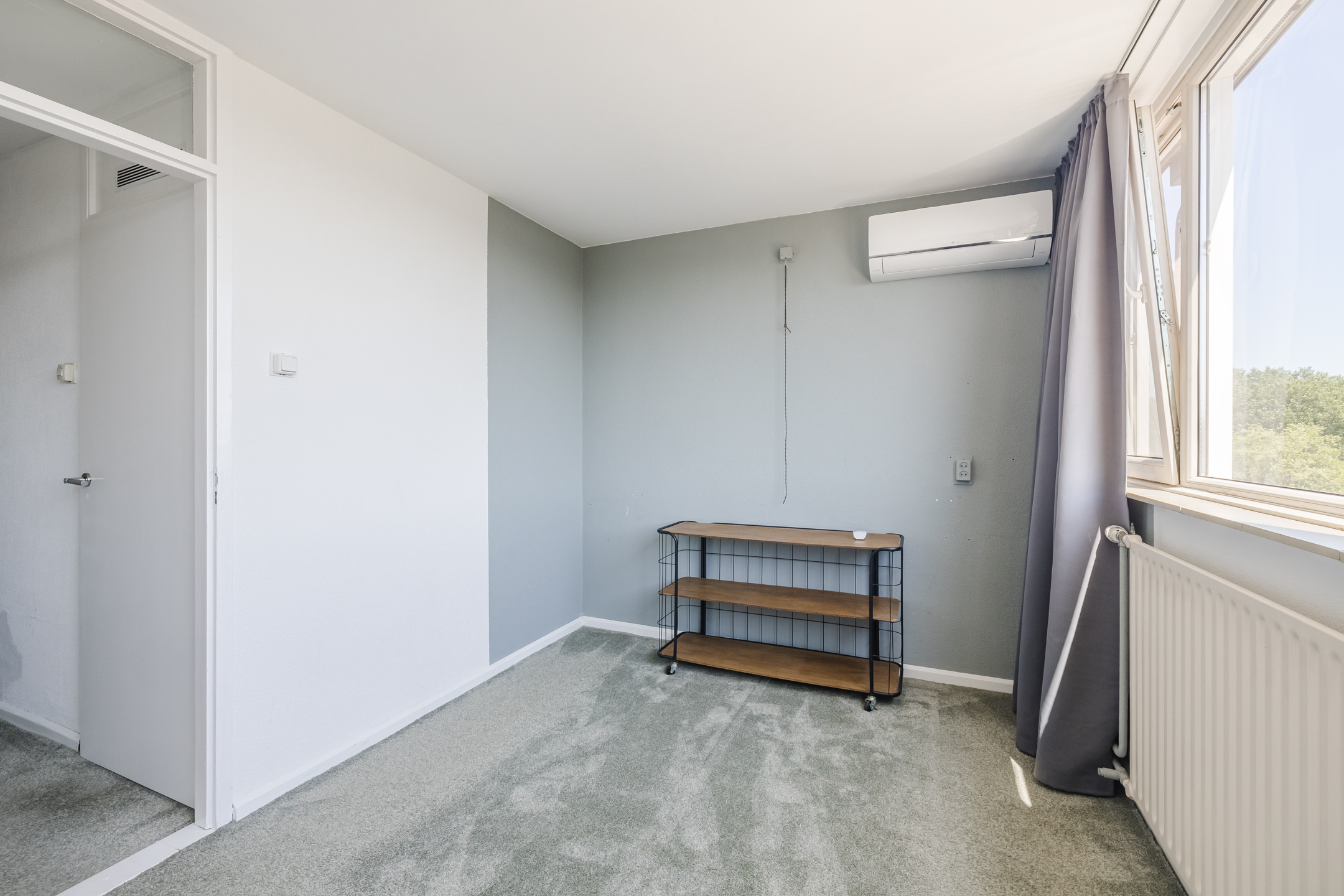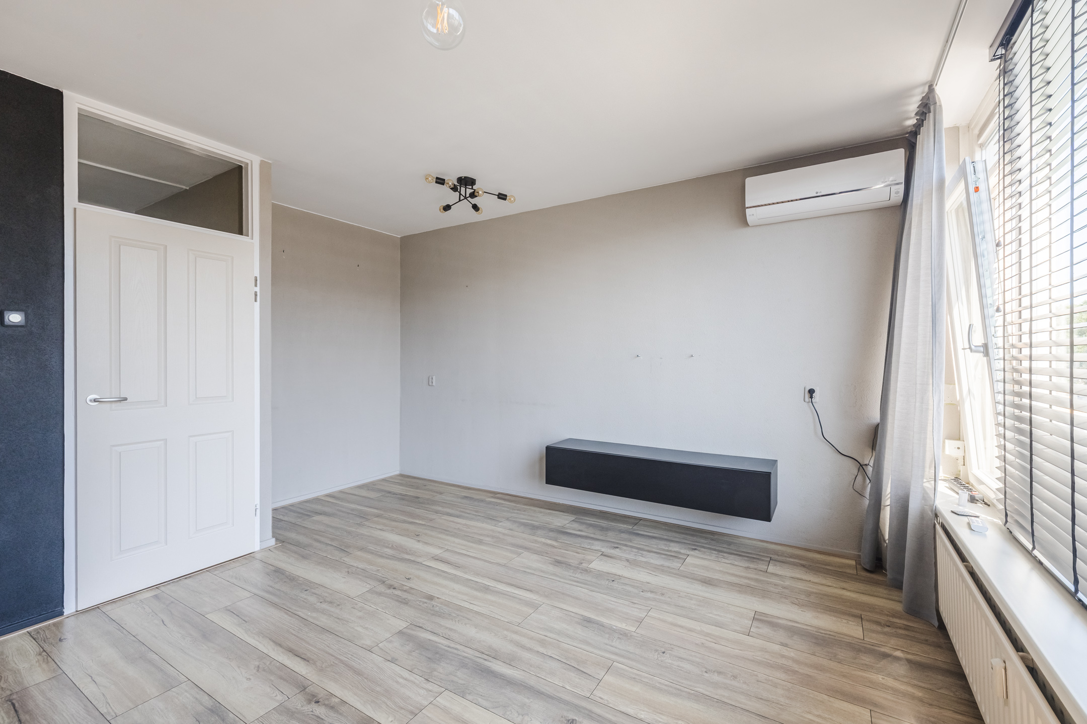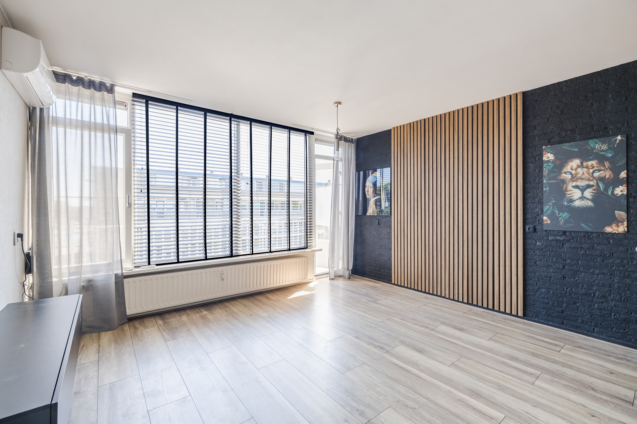 De zonnige woonkamer heeft een airco en balkon op het zuiden met vrij uitzicht.