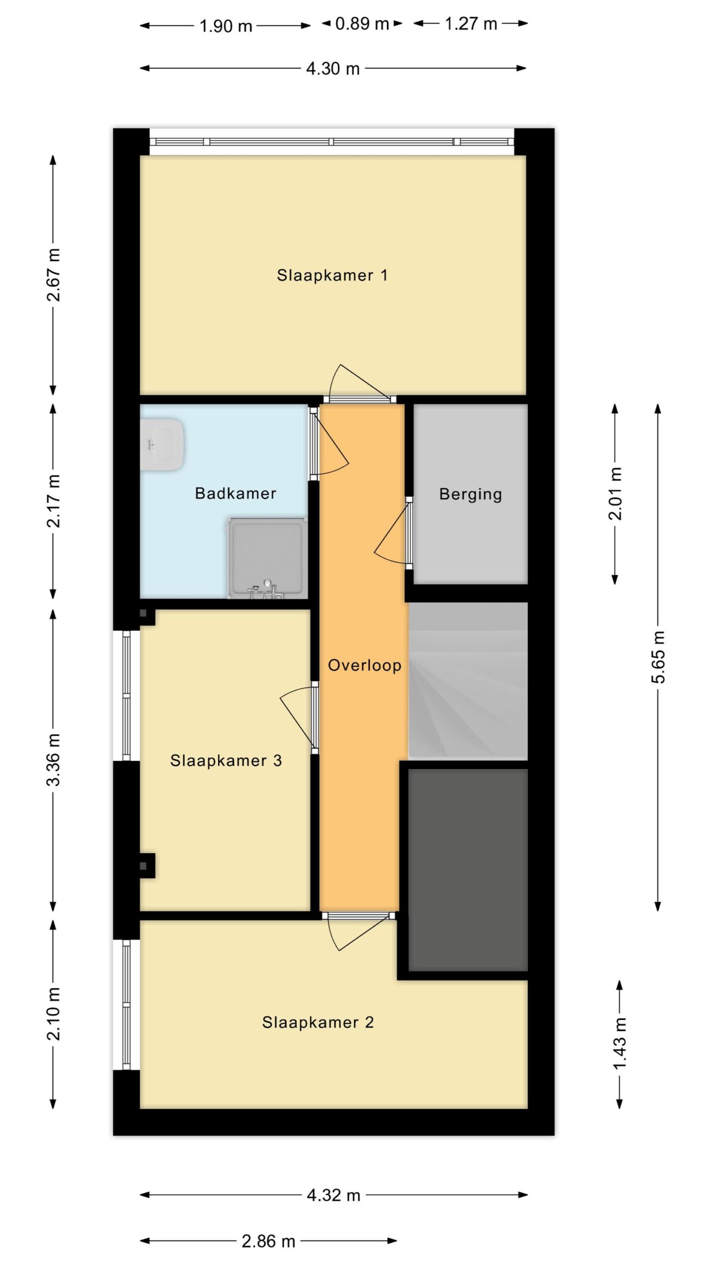 Overloop, badkamer met douchehoek en wastafel, 3 slaapkamers waarvan 1 is voorzien van een airco,
