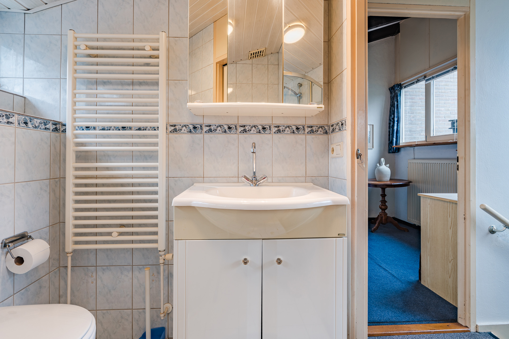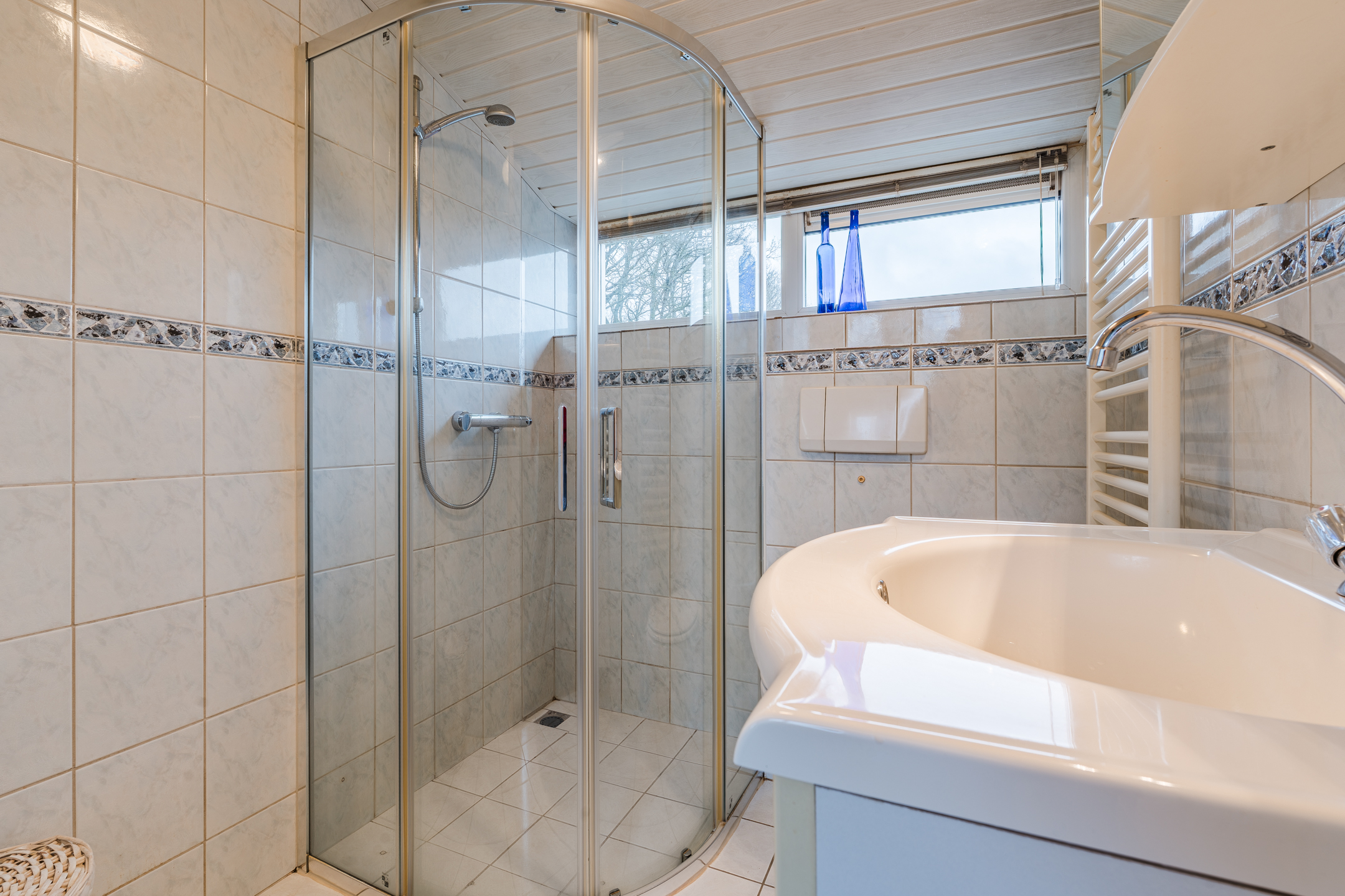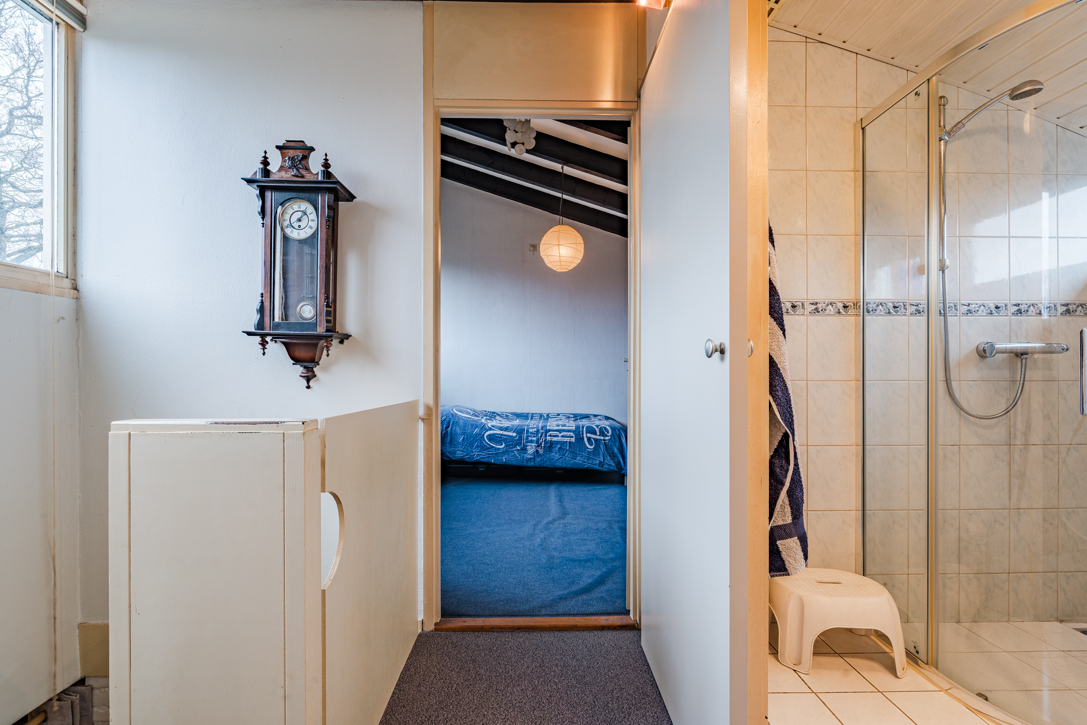 Overloop met toegang tot twee slaapkamers en de badkamer, welke is uitgerust met een douchehoek, tweede toilet en wastafelmeubel.