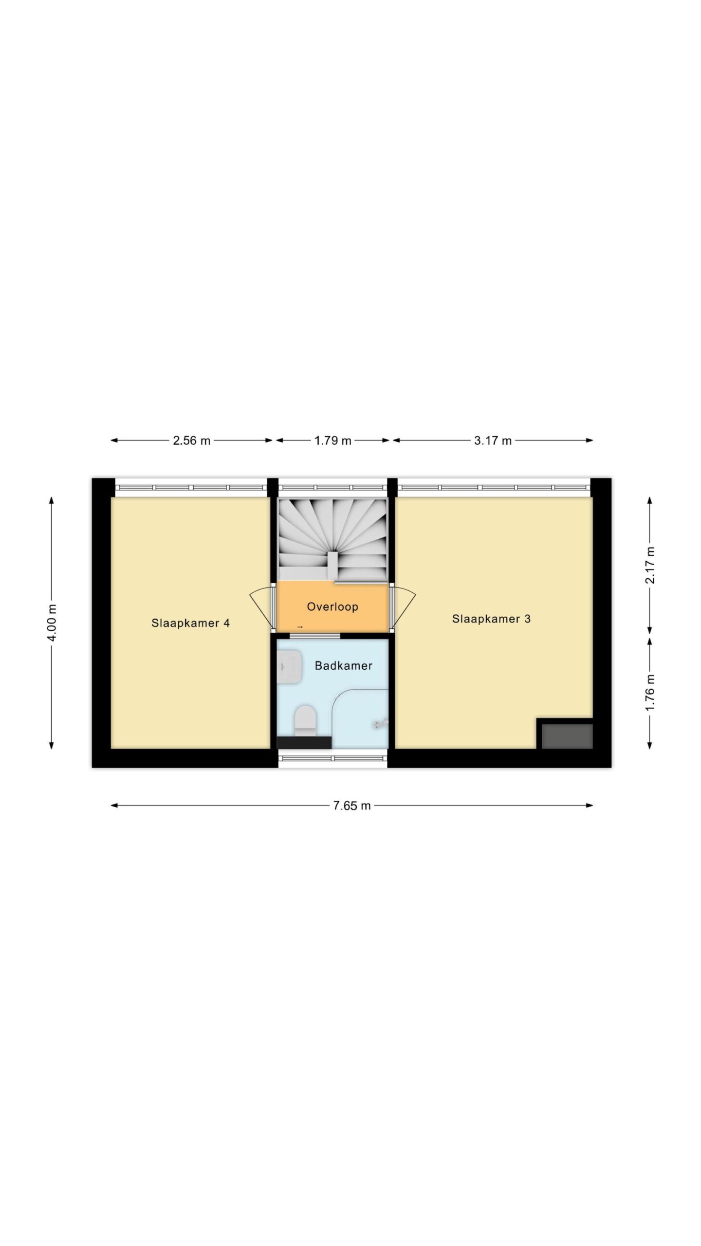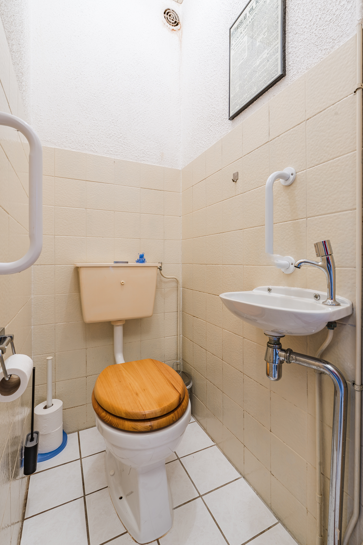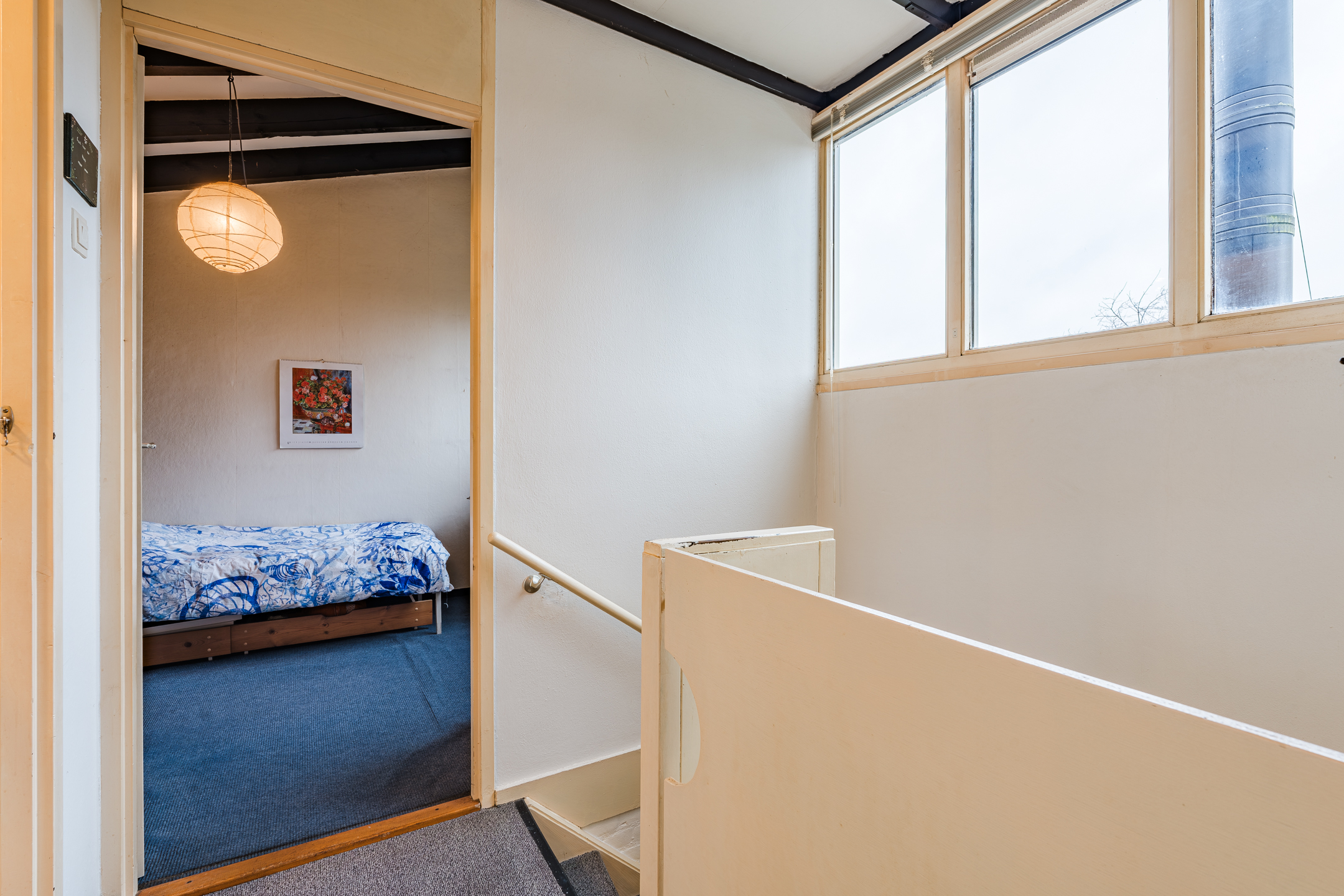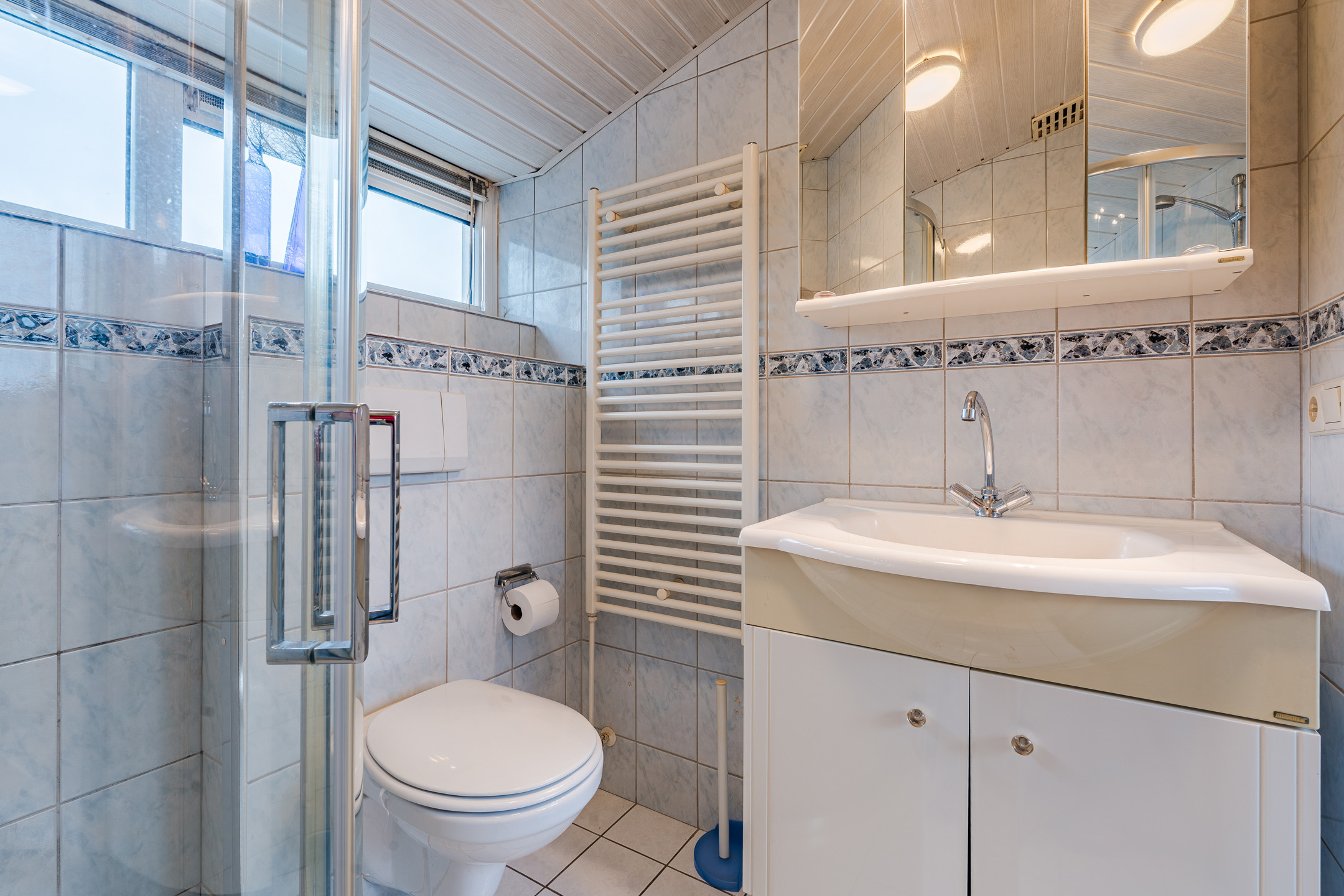 Overloop met toegang tot twee slaapkamers en de badkamer, welke is uitgerust met een douchehoek, tweede toilet en wastafelmeubel.